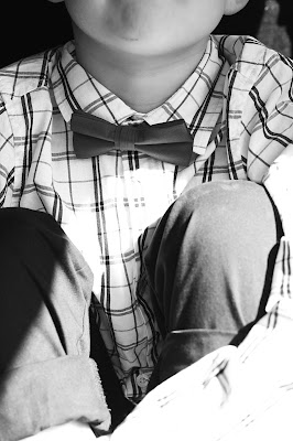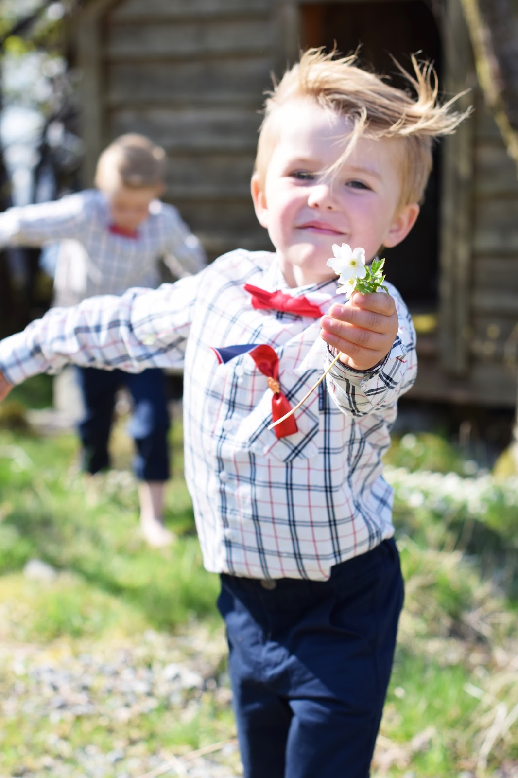 Gutta har på seg blå chinos, rutete skjorter og røde sløyfer.