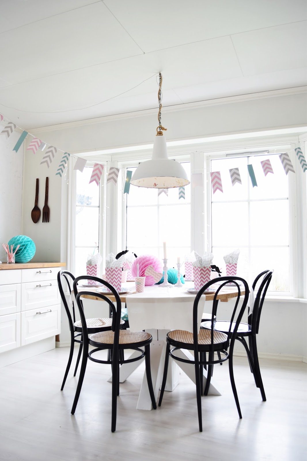 Over hvert bord festet vi risplamper. Det hjalp til å få fokuset bort fra de svæææære lysrørene i taket. :/